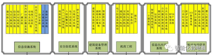 醫(yī)院智能化系統(tǒng)可拆分6大子系統(tǒng),包括信息基礎設施系統(tǒng)、公共安全系統(tǒng)、醫(yī)護專用系統(tǒng)、建筑設備管理系統(tǒng)、綜合集成管理系統(tǒng)、機房工程。