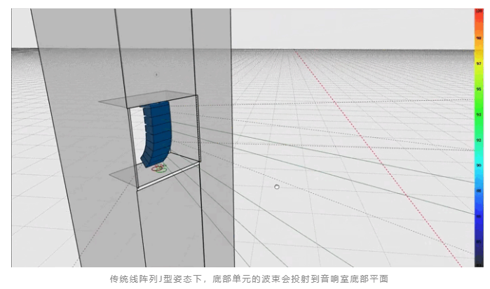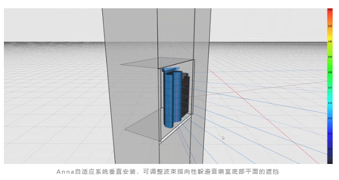 在暗裝的方式下音響室空間通常狹小緊湊。在本項(xiàng)目中,音響室的底部平面距離陣列僅10厘米。如果采用傳統(tǒng)線陣列的擴(kuò)聲系統(tǒng),陣列會形成J字型物理姿態(tài),不僅占用較大的安裝空間,J型底部的音箱單元還有可能將聲能投射到音響室的底部平面上,導(dǎo)致大部分高頻能量無法穿透出來,從而無法覆蓋到一部分前區(qū)的觀眾區(qū)。選用Anna,它的垂直吊裝方式既能節(jié)約了安裝空間,還能將高中低頻單元統(tǒng)一的盡可能靠近透聲幕,躲避音響室底部平面對波束的遮擋,最終實(shí)現(xiàn)幾乎全場的覆蓋。