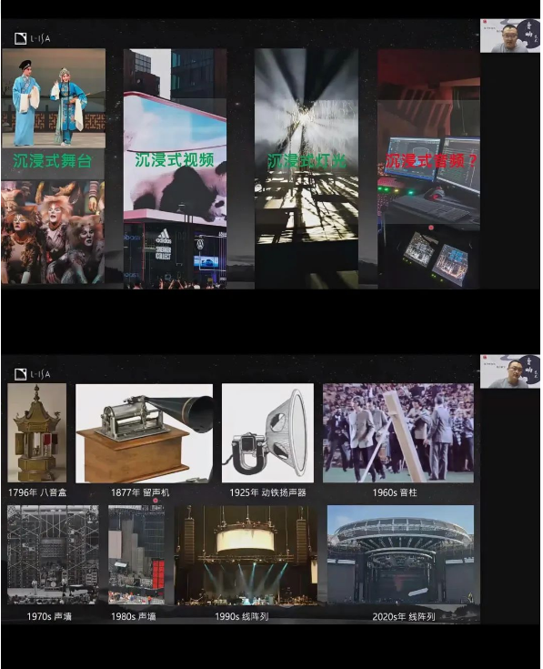 通過摩托車環(huán)繞的音效視頻,介紹了主講嘉賓與其團隊如何通過3D科技制造環(huán)繞音效,帶給觀眾沉浸式的聽覺體驗。并且講解追蹤器與拾音話筒如何結(jié)合實現(xiàn)實景與藝術(shù)結(jié)合。音響與舞臺、燈光、布景的融合是未來演出的一種趨勢,能帶給觀眾更真切的體會。