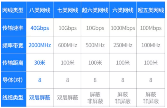 這里有必要提下八類網(wǎng)線,跟七類網(wǎng)線一樣的是雙層屏蔽(SFTP),它擁有兩個導(dǎo)線對,2000MHz的超高寬屏,傳輸速率高達40Gb/s,但它最大傳輸距離僅有30m,故一般用于短距離數(shù)據(jù)中心的服務(wù)器、交換機、配線架以及其他設(shè)備的連接。雖然八類線傳輸距離短,但傳輸速率和頻率帶寬是遠遠超過其他類的。