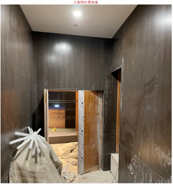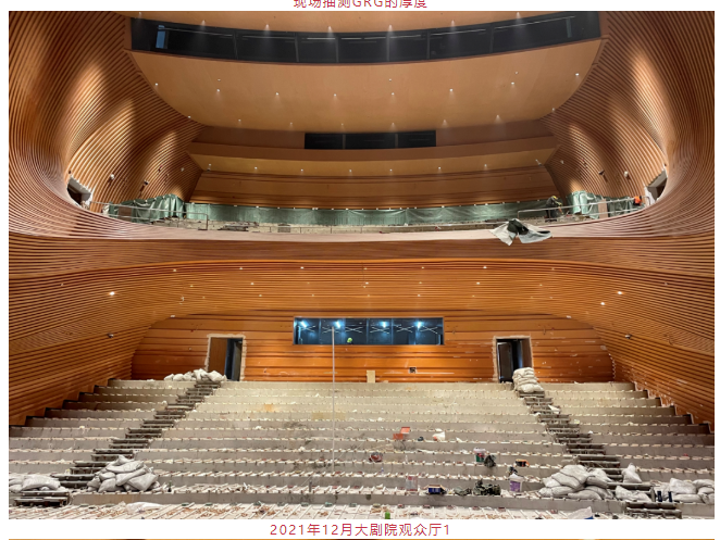 大劇院內(nèi)部的施工進度很快,短短的5個月,完成了從“鋼筋森林”到“精致劇院”的華麗轉(zhuǎn)變。大劇院內(nèi)部經(jīng)過聲學(xué)計算和模擬,側(cè)墻均采用硬質(zhì)擴散造型,保證場內(nèi)的音質(zhì)環(huán)境,后墻采用成品MLS擴散體,全場流線型的造型連貫、大氣。造型的角度、造型的尺度以及造型的面密度都嚴格按照聲學(xué)控制來落地。