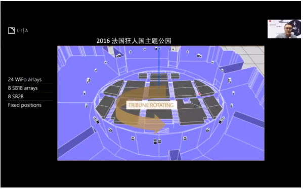 這個智能化的追蹤平臺叫做Black Trax,是一個基于視覺來追蹤的追蹤系統(tǒng),它可以在復(fù)雜的環(huán)境中實(shí)時的追蹤表演者,或任何帶有Black Trax信標(biāo)器的任何目標(biāo),還能發(fā)送定位信息到調(diào)光臺,媒體服務(wù)器或其他的第三方系統(tǒng),實(shí)現(xiàn)各個部門的聯(lián)通。2016年的法國狂人主題公園也運(yùn)用到了這個技術(shù),整個舞美的布局十分巧妙,觀眾席中間圍繞著軸旋轉(zhuǎn),音響則是圍著周邊布置一圈,共有24組。在整個的場地和觀眾座位的旋轉(zhuǎn)以及演員行走的同時,聲音還是保持了定位。